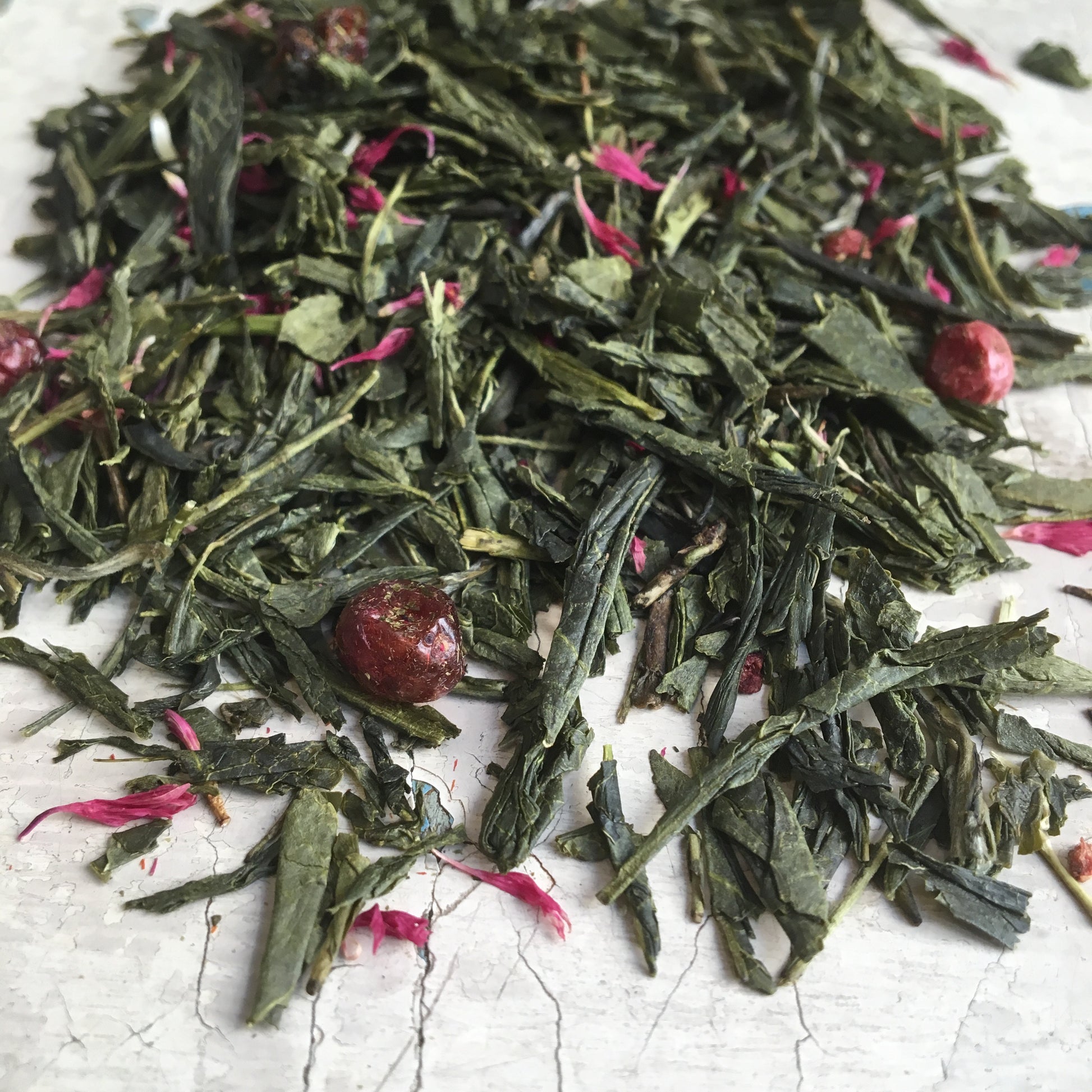 Zelený čaj jahody a hrozno. Hromadný produkt. Dostupné v 50 g, 100 g jednotkách a 50 g téglikoch. Pri nákupe väčšej hmotnosti je potrebné zakúpiť viac jednotiek (v tomto prípade uveďte, ak chcete dostať produkt v samostatných jednotkách, inak bude všetko zabalené v rovnakom vrecku).